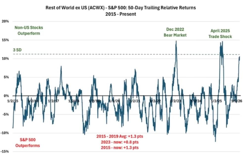 And look at this chart… International stocks are trading 3 standard deviations from the mean vs the S&P 500. This only happens .27% of the time!