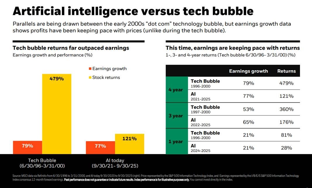 - The A.I. theme and mega cap tech companies are being compared to the Dot.com bubble. Click bait headlines are making their rounds, but this comparison is lazy. The largest tech companies in 2025 have delivered on earnings growth and guidance. They remain optimistic and CapEx spending remains robust. The comparison doesn’t match up.
