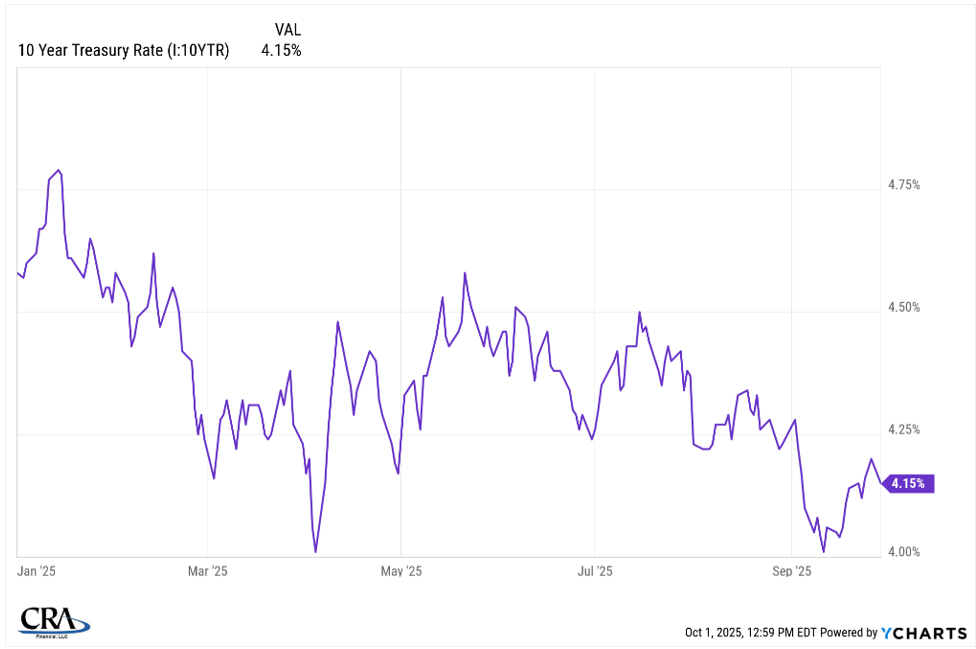 The Fed cut interest rates by .25% in September to a range of 4.00% - 4.25%. The market is expecting 70% chance of 2 more rate cuts for the year. As discussed earlier, this tends to be bullish for stock prices. If inflation data comes in hotter than expected, this could lower the likelihood of this occurring which could cause the market to sell off. Still, the trendline for interest rates appears to be heading lower, which can help boost the economy as well as the stock market. The Fed’s moves as well as their commentary will dictate much of the market moves in the months ahead to close out the year.