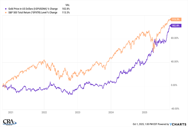 Oil prices ended the quarter at $62.37, quietly down 10% from just a year ago. Gold ended the quarter at $3,840.80 per ounce, up over 40% on a year over year basis.
